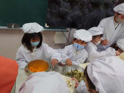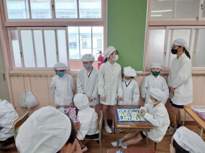 1年生が6年生と給食の時間準備をしていました。