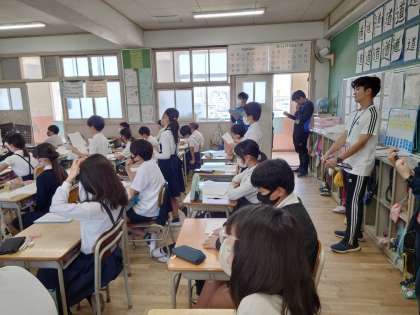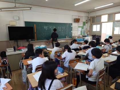 世界で一番やかましい音の感想を全体で交流していました。他学年の教員も授業を見に来ています。