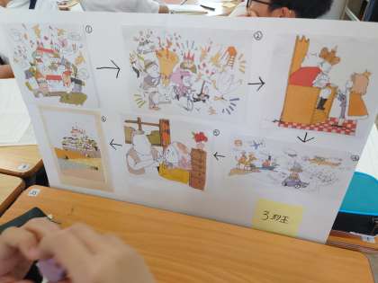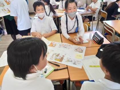 感想を交流し、班で挿絵を見ながら挿絵の順番を考えて発表しました。