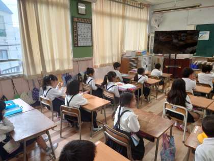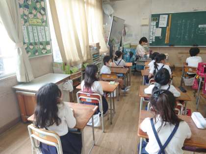 今日は天候不良のため放送朝会でした。ルールや登下校について話がありました。