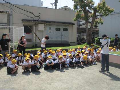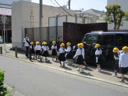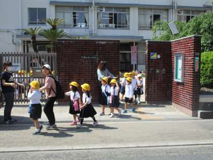 晴天の中、1年生が春さがしで長居公園に出発しました。