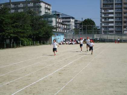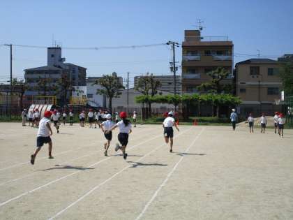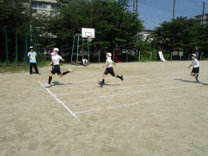 今日から新体力テストが始まりました。まず、5年生が運動場でソフトボール投げと50m走の記録をとりました。