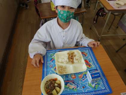肉じゃがは人参の赤、さんどまめの緑と彩りも鮮やかです。