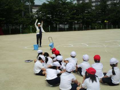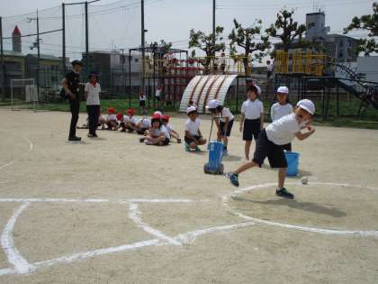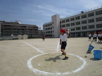 ソフトボール投げでも投げ方のポイントを聞きました。みんな頑張って投げていました。