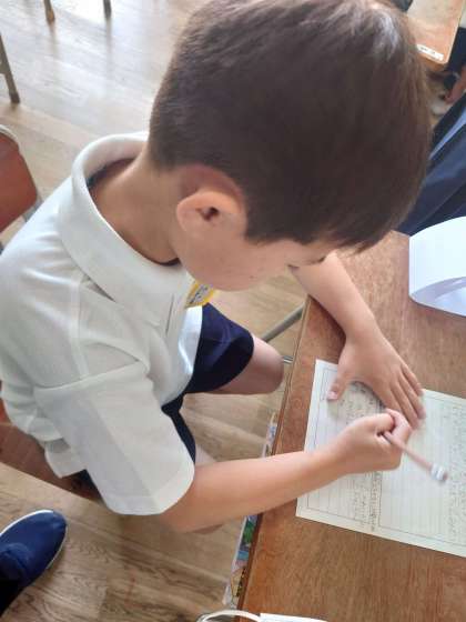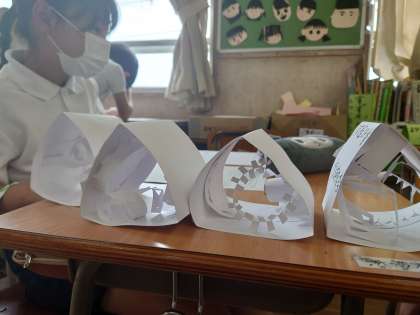 3年生が図工をしていました。今日は作った作品の振り返りシートを書いてみんなの作品を鑑賞していました。