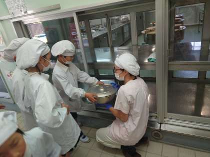 ちくわの磯辺揚げは、衣に青のりがついています。給食室でちくわを切って、衣をつけて、揚げています。