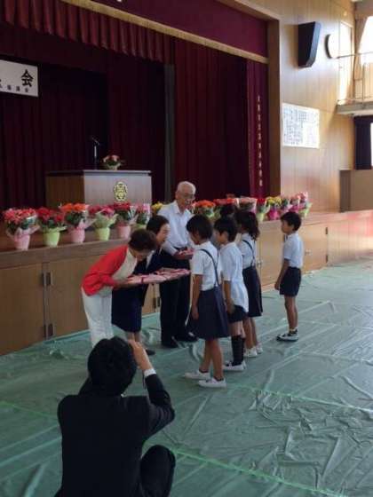 学校を代表して3年生の有志児童が参加し、頑張って作った焼き物の「箸置き」をお年寄りの皆さんに贈りました。