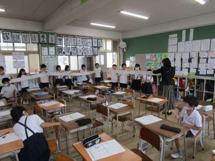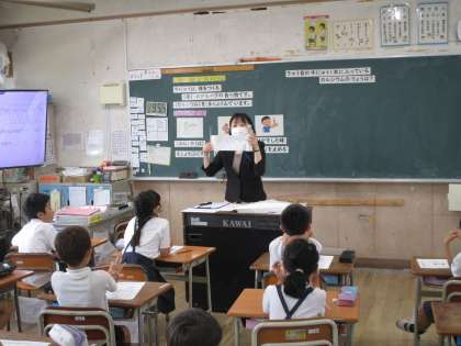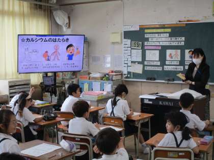 はじめに、カルシウムの3つのはたらきについて学習しました。給食で飲んでいる牛乳1本の中に入っているカルシウムの数を栄養指導の先生の手作り教材で、視覚的に捉えることができ、子どもたちは「すごく多い」と驚いていました。他にも、小学生は1日に牛乳2本を飲むといいことや1日に700このカルシウムをとるとよいことを学習しました。