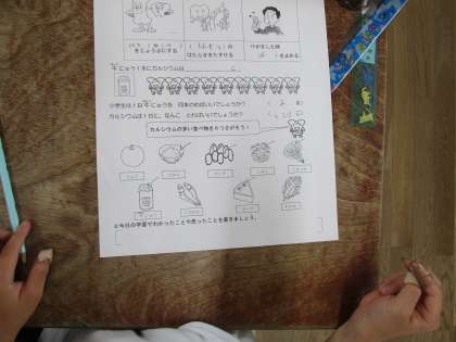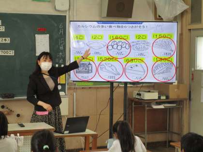 牛乳以外でカルシウムがたくさん入っている食べものを子どもたちは予想しました。意外な食べ物にカルシウムがたくさん入っていることに子どもたちは、「えー」とびっくりしていました。