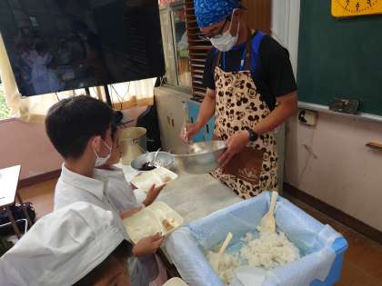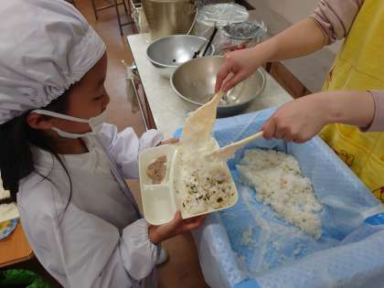 豚肉の甘辛やきは人気があります。1、2年生がおかわりをしていました。