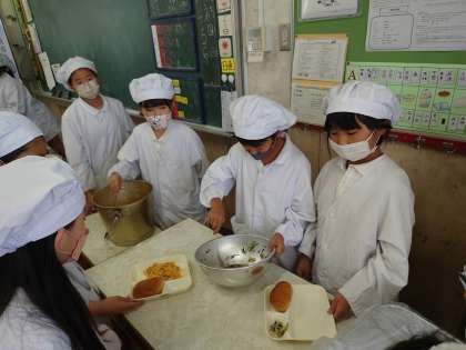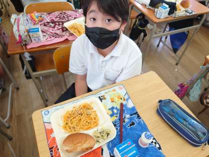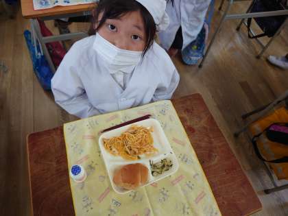 チキントマトスパゲッティは鶏肉、ウィンナーを主材に、玉ねぎ、トマト缶、人参、ピーマンを使用し、バジルで風味をつけたとまとあじのスパゲッティですが