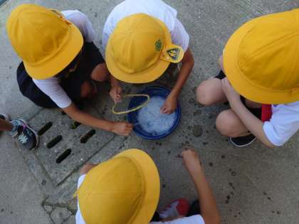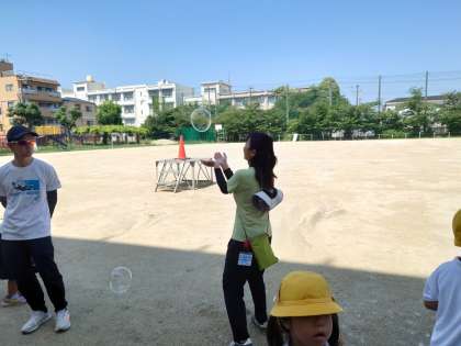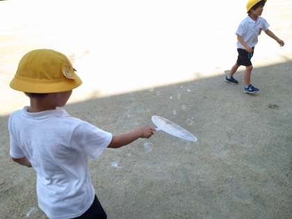 1年生が運動場でシャボン玉を作っていました。