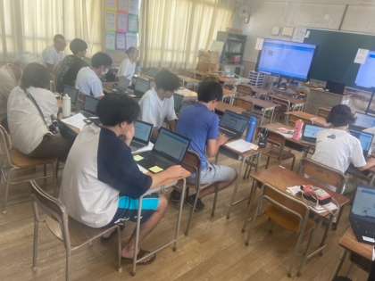 先生たちが、2台のパソコンとにらめっこしながら研修しています。