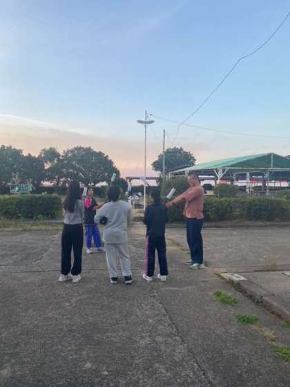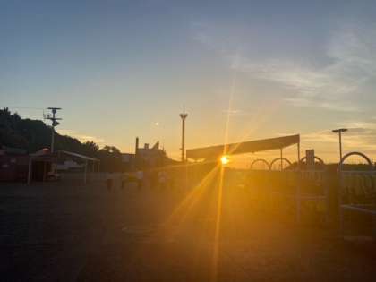 キャンプファイヤー係はリハーサルのために一足先に会場に行きます。夕焼けがきれいです。