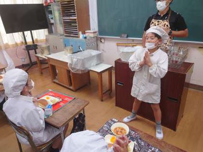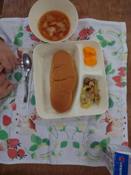 9月は食物アレルギー対応サポート月間です。本日のグラタンは小麦粉の代わりに上新粉、牛乳の代わりに、豆乳が使用されています。マカロニも小麦粉ではなく米粉を使用しています。
