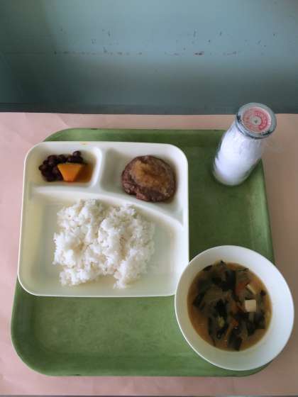「和風おろしハンバーグ、みそ汁、かぼちゃのいとこ煮、ごはん、牛乳」です。