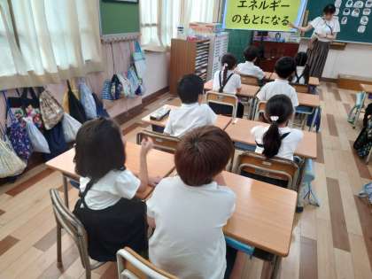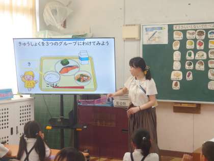 一年生、苅田小学校の栄養教諭の先生に来ていただき栄養指導を受けていました。