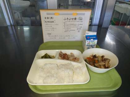 秋の味覚を盛り合わせた煮物のことをふきよせ煮といいます。今日の給食では、れんこん、里芋、しめじなどが入っています。今日はたくさんの具材を切ったそうです。