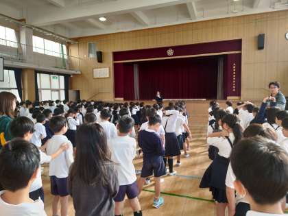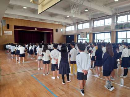 月曜日講堂で朝会がありました。今日は50周年行事の呼びかけの練習をしていました。