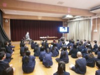 10月16日は創立記念日です。講堂は針ヶ池という池だったこと、校章の意味の話を聞きました。