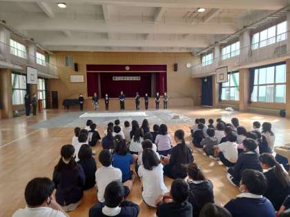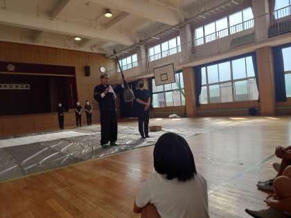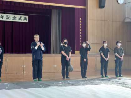 今日は5年生から書道パフォーマンスが始まります。
