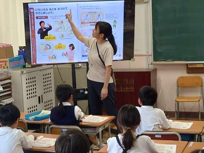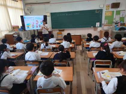 1年生が音楽をしていました。みんなで歌を歌った後に今から楽器を使って学習するようです。