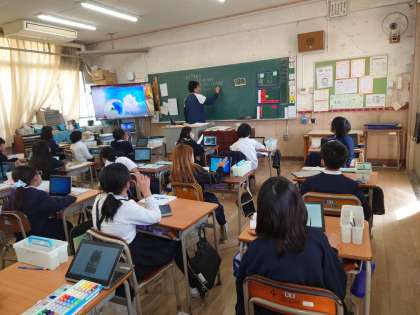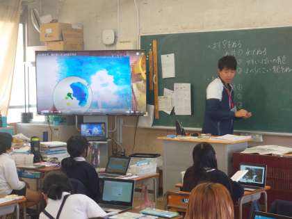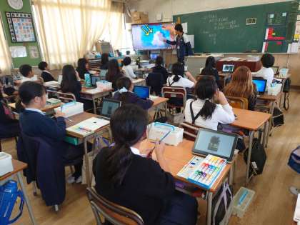 4年生が図工をしていました。自分たちでタブレットでとった木を描くようです。描き方を学習していました。。