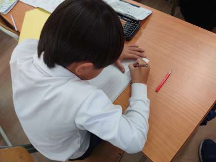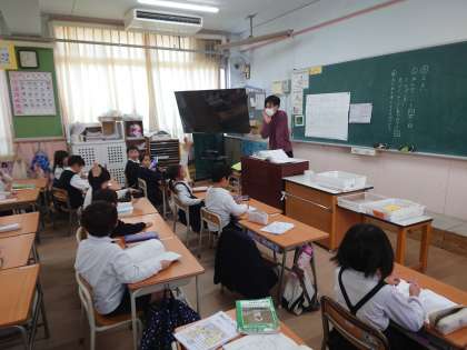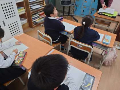 4時間目が始まる前に1年生が連絡帳を書いていました。