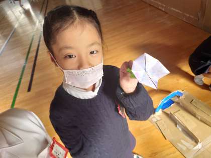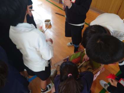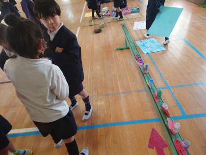 2年生が作ったおもちゃで1年生が遊んでいます。