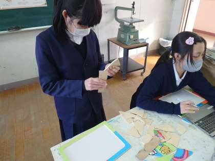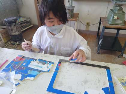 図工室では5年生が図工をしていました。パズルを作っています。下書きをして電動のこぎりでそれぞれ切っています。