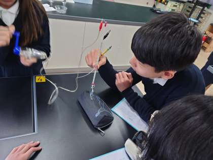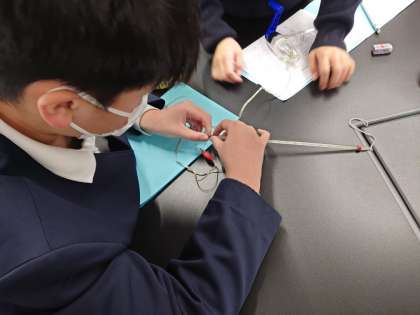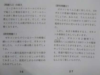 手回し発電機を使っていろいろな実験をしていました。温度計の液溜まりに巻き付けて実際に回すと温度が上がるのを体験しています。