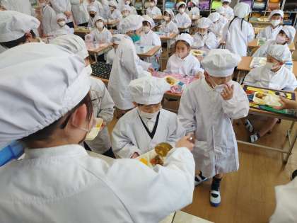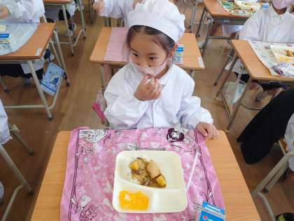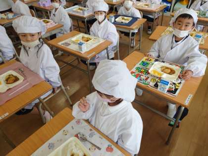 今日は入学お祝い献立です。カツカレーにフルーツゼリーです。