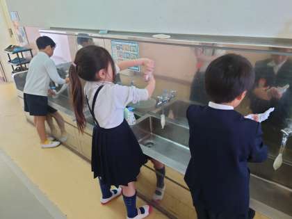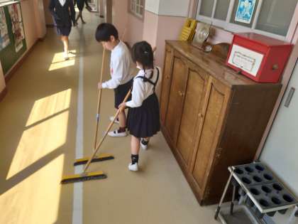 職員室前廊下は2年生が掃除をしています。