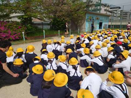理科室で火災が起きたという想定で避難訓練を行いました。新しい学級で初めての訓練です。