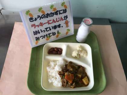 「ビーフカレーライス、カリフラワーのサラダ、うずら豆のグラッセ、牛乳」です。うずら豆のグラッセは、柔らかく煮たうずら豆に、砂糖・塩・バターで味をつけました。