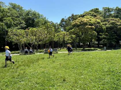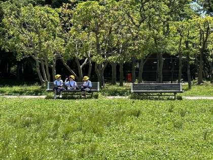 広場で走ったり、ベンチで休んだりしています。