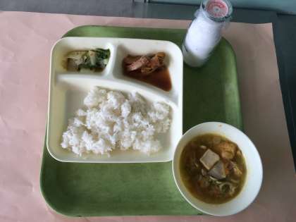 「豚肉のしょうがじょうゆかけ、けんちん汁、大阪しろなのおひたし、ごはん、牛乳」です。大阪しろなは、なにわの伝統野菜のひとつです。大阪市の天満橋付近で栽培が盛んだったので、「天満菜」とも呼ばれます。