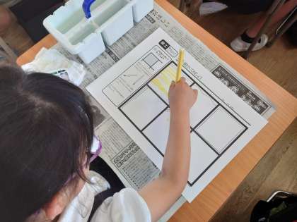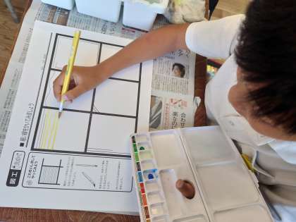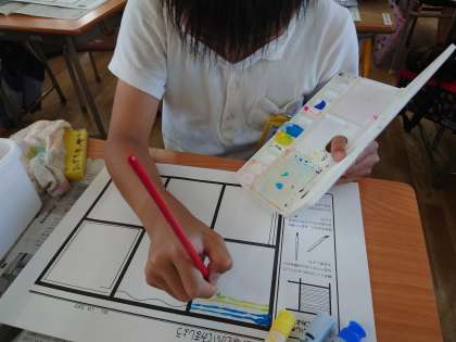 絵の具は6つのお部屋に絵の具で線を引いていました。筆をたててできるだけできるだけ細い線を引いていました。