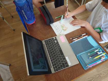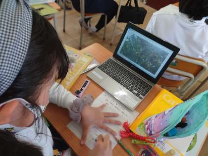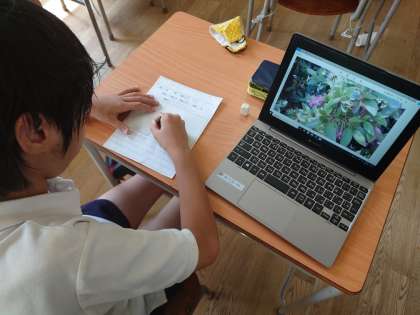 4年生は理科をしていました。校内でそれぞれ撮影した植物を観察カードに描いていました。