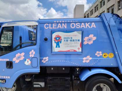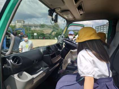 4年生が講堂前で学習していました。西南環境事業センターの方に来ていただいてパッカー車を見せてもらっています。