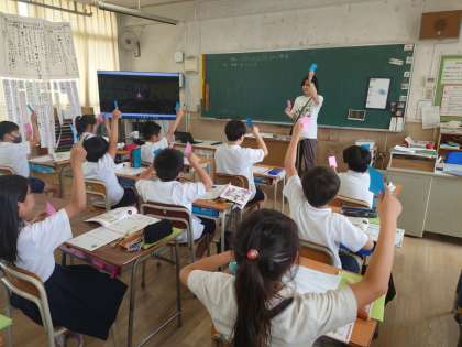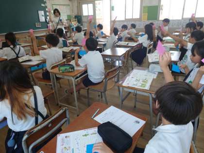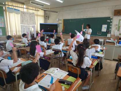 4年生が音楽をしていました。鑑賞の学習で歌っている二人の声が聞こえたらカードをあげていました。