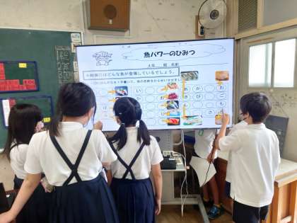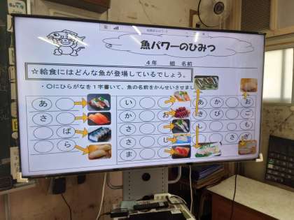 魚の絵とお寿司や刺し身の絵をヒントをもとに考えていました。