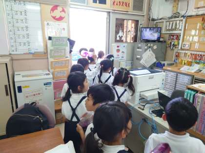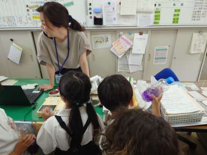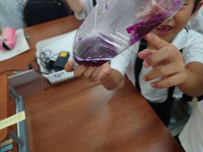 1年生がアサガオの色水を作って職員室に見せに来てくれました。