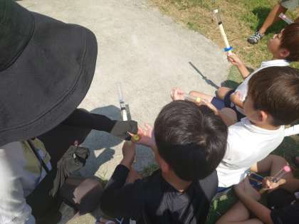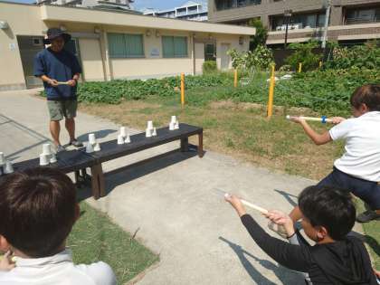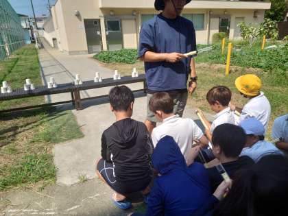 4年生が理科をしていました。空気鉄砲、水鉄砲を使って学習していました。まずは空気鉄砲で的を狙っています。