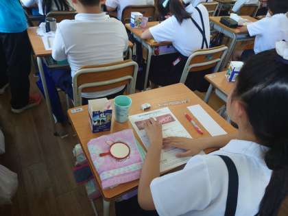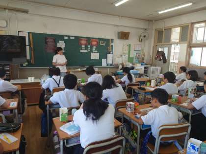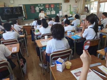来られた先生の話をしっかりと聞いています。鏡で自分の口の中をチェック