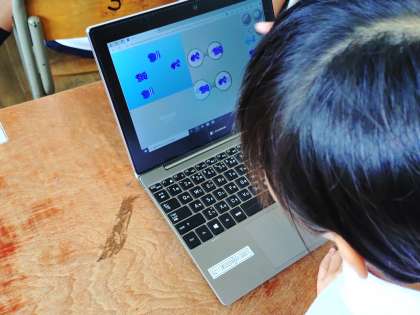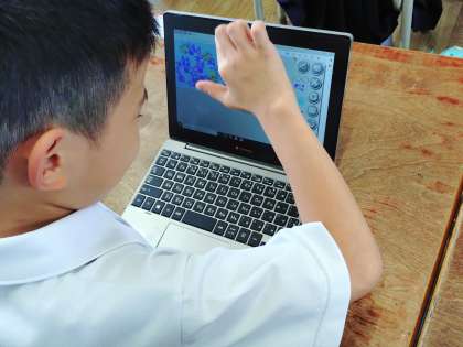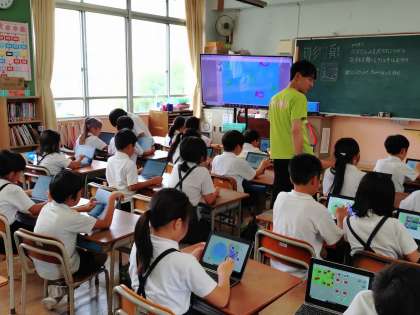 2年生がタブレットを使っていました。こちらはビスケットを開いて、アニメーションを作っていました。