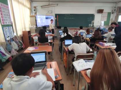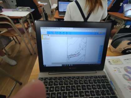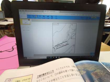 工場の学習です。タブレットで資料を送って学習しています。それぞれが二本の線を引いた内側が太平洋ベルトということを学習していました。
