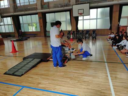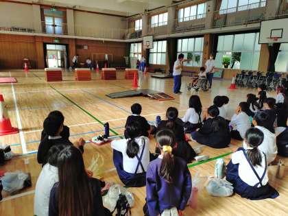 5年生が車いす体験を講堂でしていました。