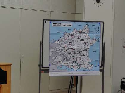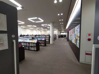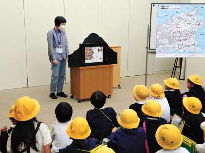 館の方からお話を聞いています。その後図書館をまわります。
