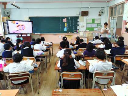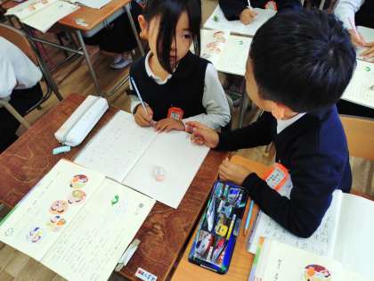 人がすることをあらわすことばの学習です。書けた子は手を頭において先生にアピールです。お隣と相談しながら学習しています。